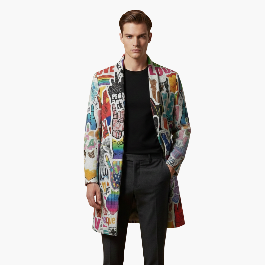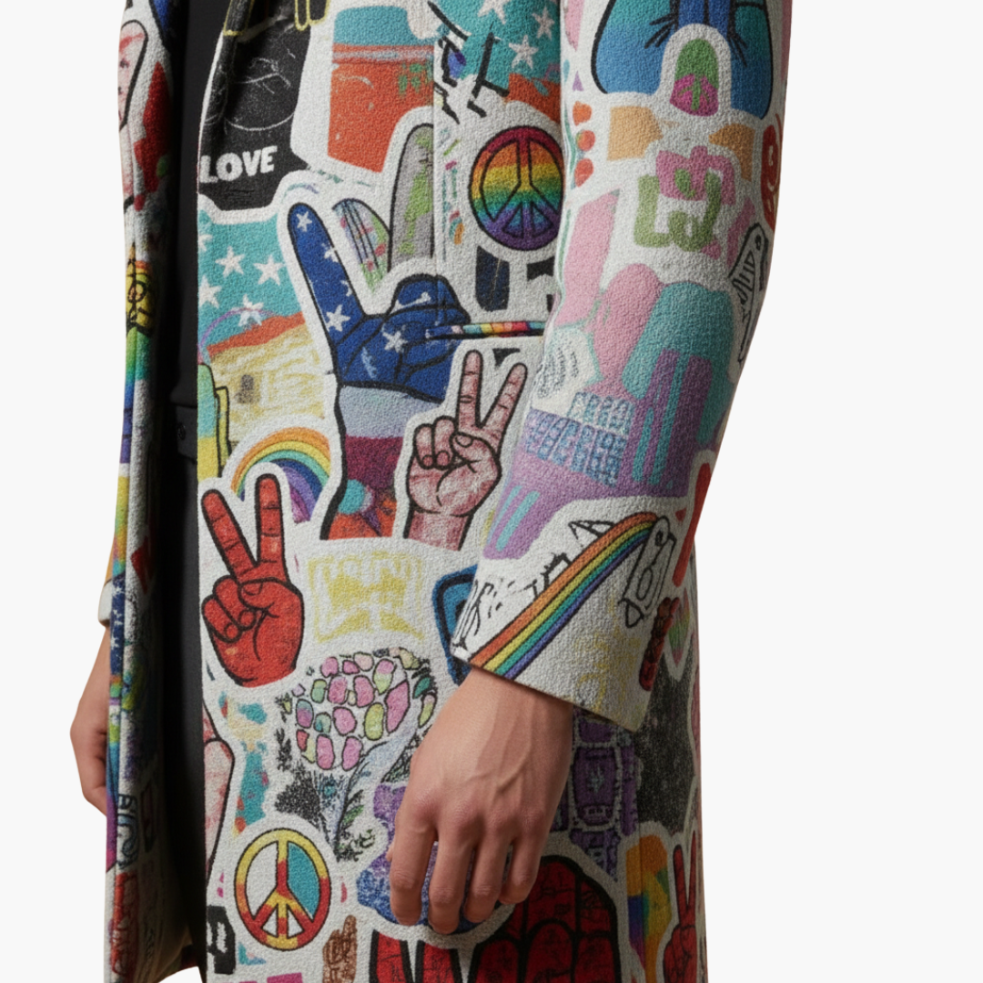The Kaevorin | Open-Front Graphic Long Coat For Men is designed to make a confident statement through pattern and structure. Featuring an open-front neckline without closure, this long coat allows relaxed layering over shirts, sweaters, or tailored pieces. The multi-pattern printed surface showcases mixed graphic motifs across the entire exterior, creating strong visual texture. Full-length sleeves and a straight hem maintain a balanced silhouette, while integrated side pockets add everyday practicality.