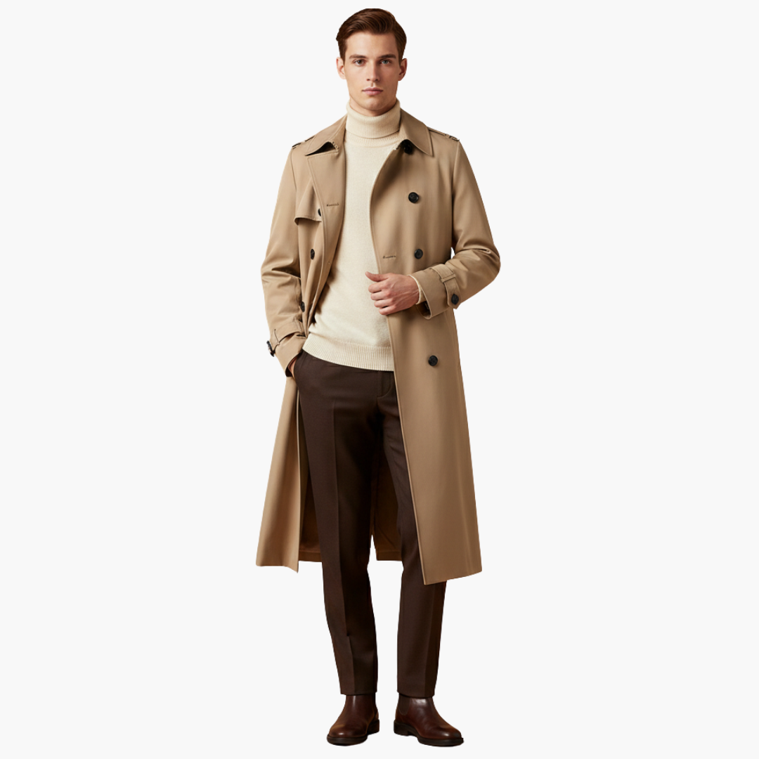 The Valerio | Over-the-Knee Belted Trench Coat For Men combines timeless design with practical length—an essential outer layer for sophisticated cold-season wardrobes.